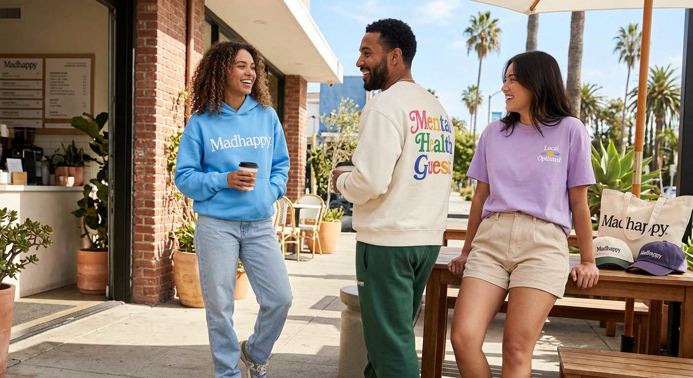 Beyond the clothing itself, Madhappy operates The Madhappy Foundation (a 501(c)(3) nonprofit that contributes 1% of net sales to mental health initiatives) and runs The Local Optimist, a digital platform featuring podcasts, wellness hotlines, stories, and content centered on mental health conversations. The brand markets itself not as fashion for the sake of fashion, but as a tool for self-expression rooted in positivity.